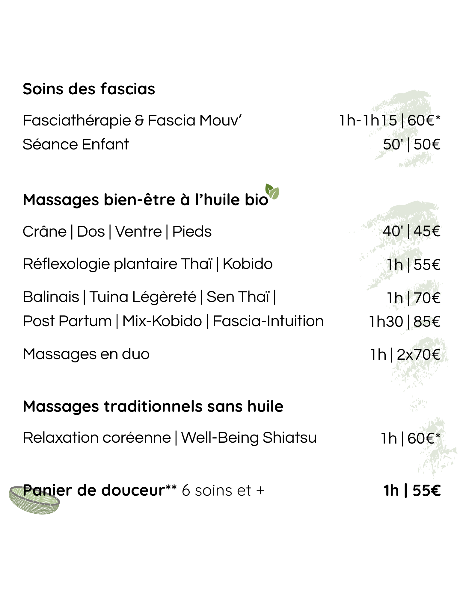 Pour tous les soins, prévoyez 15-20 minutes supplémentaires pour vous installer confortablement, puis retrouver tranquillement le rythme de votre journée en fin de séance.